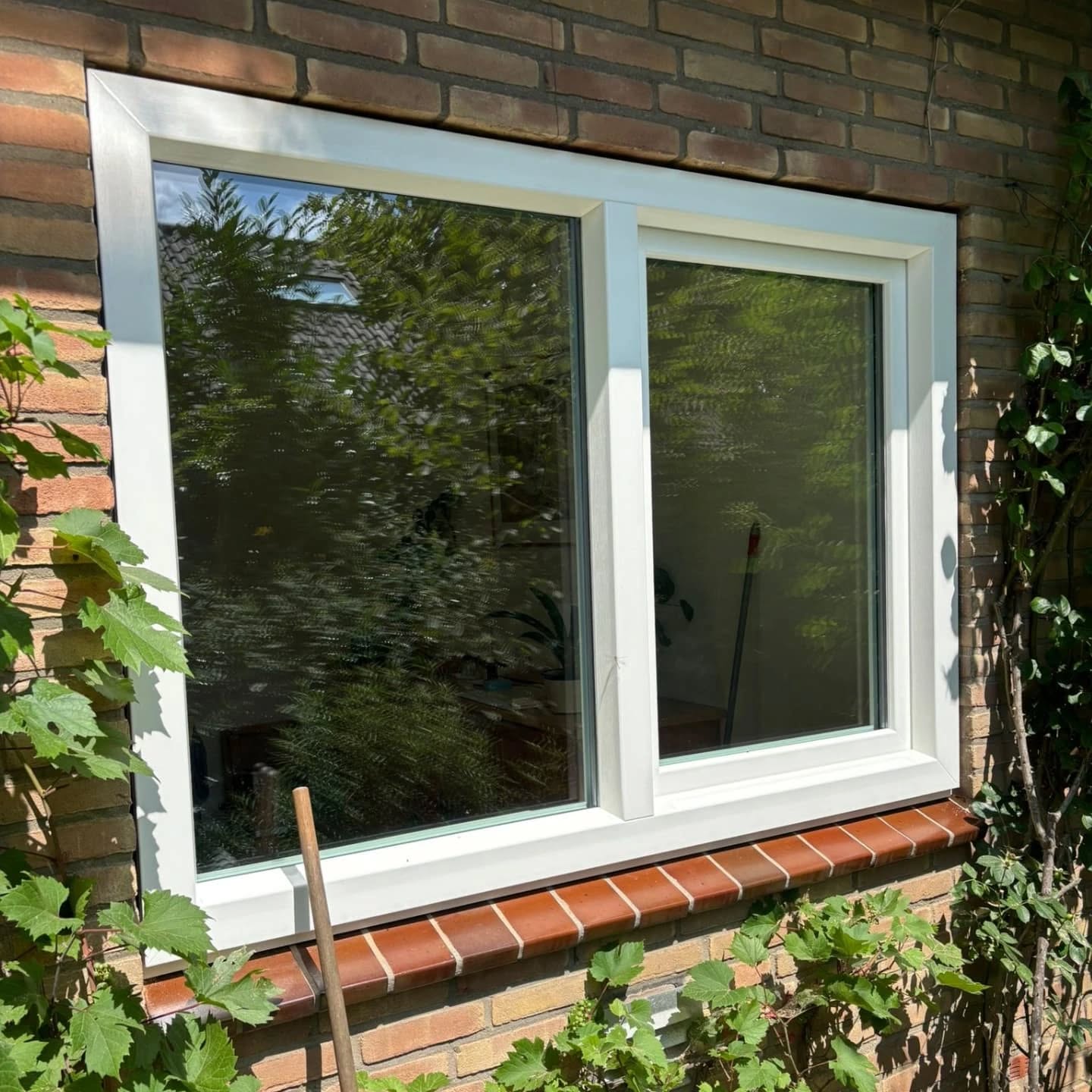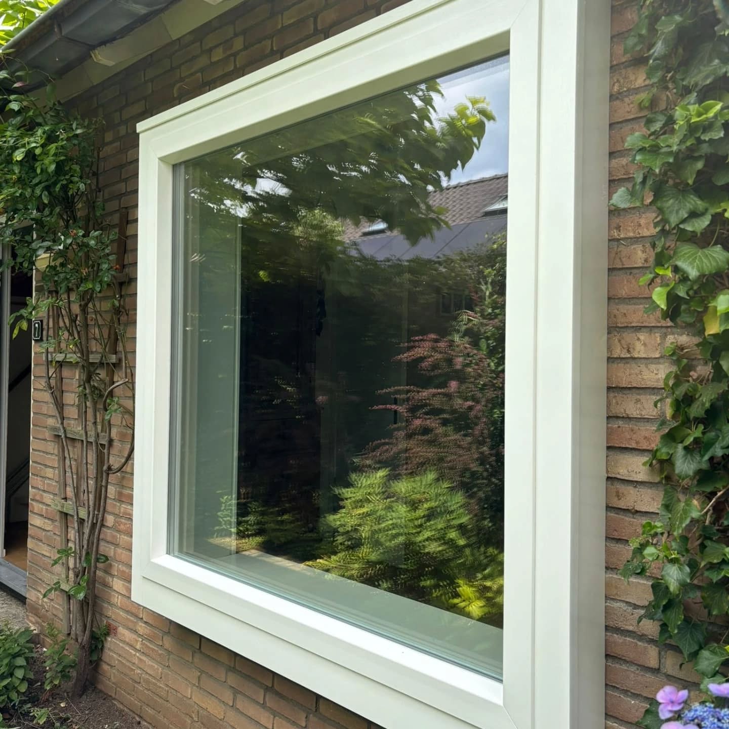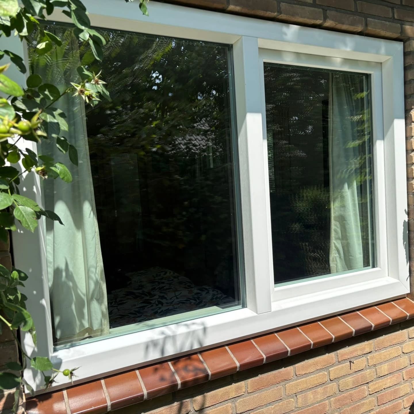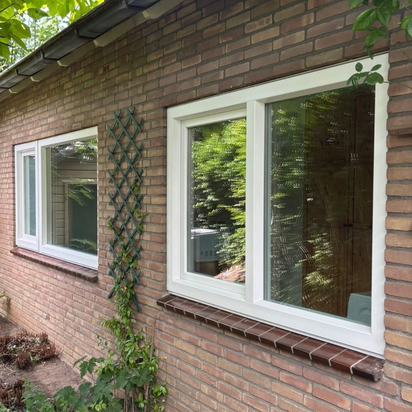 De witte kunststof kozijnen geven de woning een heldere en verzorgde uitstraling. Dankzij de slanke profielen komt er veel daglicht naar binnen, waardoor de kamers ruimer en lichter aanvoelen. De grote ramen zorgen bovendien voor een beter uitzicht en meer verbinding met de tuin.