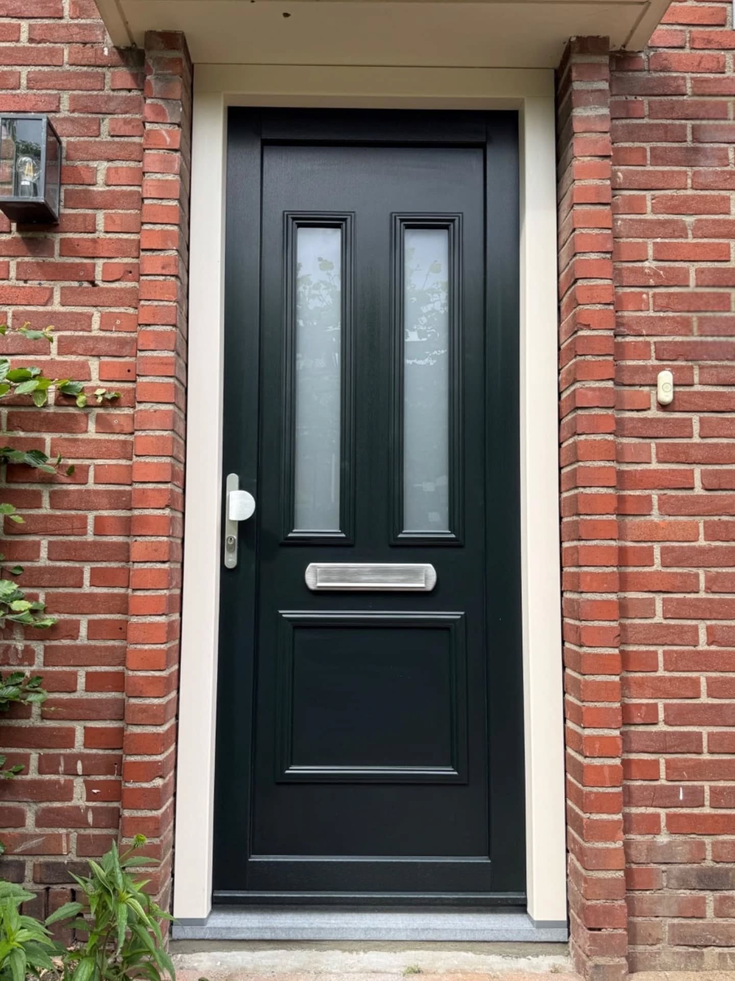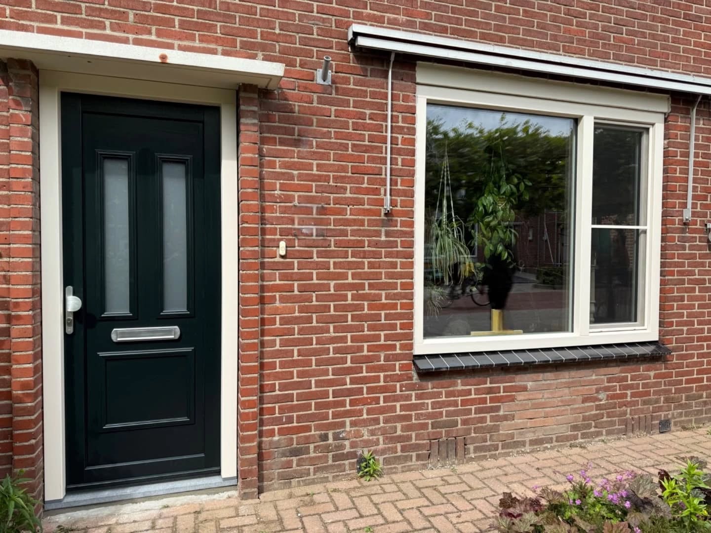 De nieuwe kunststof voordeur is een echte blikvanger. De donkere kleur steekt mooi af tegen de rode bakstenen en geeft de woning een moderne en verzorgde uitstraling. De deur is voorzien van isolerend glas en een stevige constructie, waardoor tocht en kou geen kans meer krijgen. Daarnaast zorgt de meerpuntssluiting voor extra veiligheid en een gevoel van zekerheid.